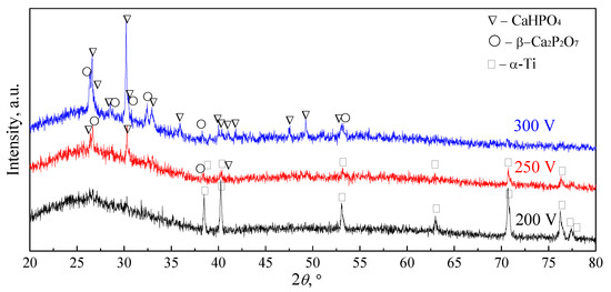 X-ray diffraction (XRD) patterns of the CaP coatings formed at 200 V, 250 V, and 300 V.