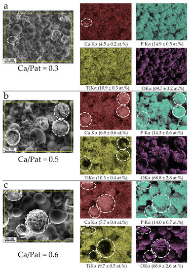 Figure 4 shows the SEM images and EDX maps of the distribution of the chemical elements (calcium, phosphorus, titanium, and oxygen) over the coating surface. EDX gray-level maps showed that all elements (Ca, P, Ti, and O) were distributed fairly uniformly over the surface of the coating formed at low voltages of 150–200 V (Figure 4a). With increasing applied MAO voltage, the Ca content in the coatings increased from 4.5 to 7.7 at.%, and in contrast, the P, Ti, and O amounts slightly decreased. Increasing the Ca concentration in the coatings led to an increase in the Ca/P atomic ratio from 0.3 to 0.6. The corresponding maps showed that the increased Ca was mainly concentrated inside the destroyed hemispheres with plate-shaped crystals (these areas are marked by white circles in Figure 4b,c). However, the EDX maps show that the oxygen and phosphorus distribution reproduced the rough topography of the coating (Ra = 5.0–6.5 μm).
