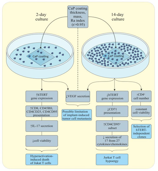 Thus, the variable morphofunctional response of widely used Jurkat T cells cocultured with CaP-coated samples should be considered when testing materials that are meant to have durable contact with the human body, especially in cancer patients. The main results are presented in Figure 7. Therefore, many in vitro estimations of implant biological properties may change in long-term cell cultures.