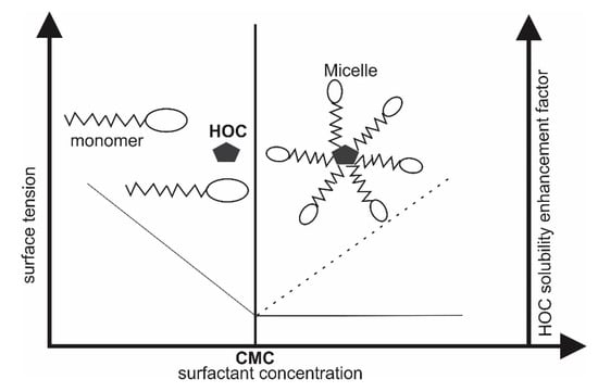 - Synthetic surfactants: Surfactants are a class of amphiphilic chemicals composed of hydrophilic water-soluble heads and hydrophobic or water insoluble tails. Their unique molecular structure give them the ability to solubilize relatively insoluble xenobiotics including hydrophobic soil contaminants [6]. They are characterized by their chemical structures, hydrophobic-lipophobic balance, and their critical micellar concentration (CMC). The latter is defined as the surfactant concentration above which micelles are formed and all additional surfactants added to the solution go to the micelles (Figure 3) [36,42,43]. The solubility of hydrophobic organic compounds (HOCs) is strongly enhanced at a surfactant concentration above the CMC along with a decrease in surface tension [36]. Three different mechanisms are reported to be involved in surfactant enhanced removal of hydrophobic organics sorbed to soils, which include a decrease in interfacial tension, phase transfer of HOCs from soil-liquid interface to micellar pseudo-aqueous phase, and solubilization of the HOCs inside the hydrophobic enclosure formed by micelles [44]. Surfactants can be classified as anionic (e.g., sodium dodecylsulfate and linear alkylbenzene sulfonate), cationic (quaternary ammonium derivatives), non-ionic (Brij 35, Tween 80, Triton X-100), and amphoteric (cocoamidopropyl hydroxylsultaine), but non-ionic surfactants are preferred due to their lower soil sorption ability, cost effectiveness, and higher solubilization capacity [36]. Several studies have reported the use of different synthetic surfactants for the remediation of PAHs from contaminated soils both on laboratory and pilot scales [2,6,12,13,14].