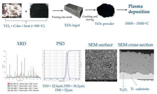 Sub-stoichiometric TiO2 are a series of conductive oxides known as Magneli phase with the general formula TinO2n−1 (3 ≤ n ≤ 10) [104], Ti4O7 and T5O9 being the most conducting and desired of the series. The thermal reduction of TiO2 usually yields a mixture of oxides in this series. However, the quality of the electrocatalyst is enhanced by converting the other suboxides of Ti in the mixture to Ti4O9 and T5O9. Reduction methods including high temperature (10,000–15,000 °C) plasma elaboration have been tailored to prepare materials that consist primarily of Ti4O7, with conductivity as high as 166 Ω−1 cm−1 [18,87,96,104]. Ceramic conductive Magneli phase electrodes which consist primarily of Ti4O7 are commercially available and, currently, are sold under the trade name Ebonex®. However, many laboratories prefer to synthesize this electrode to achieve more controlled properties and composition and enhance the electrocatalytic activity [105]. Both Ebonex® and laboratory synthesized sub-stoichiometric TiO2 have been used in different configurations (plate, disc, tubes, flat, and tubular membranes) for electrochemical wastewater treatment [96,106], and studies that have compared Ebonex® with a BDD anode have shown that fewer •OH radicals are generated by the Ebonex® anode but they are more reactive than those formed by a BDD electrode [107]. A typical synthesis route and characteristics of plasma elaborated substoichiometric TiO2 is shown in Figure 6.