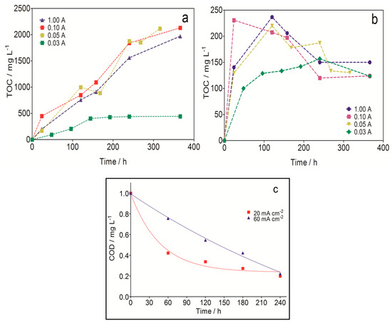 TOC evolution as a function of time at (a) anodic and (b) cathodic compartments during the electrokinetic soil remediation (EKSR) applying different current values at 25 °C with 0.1 M Na2SO4 as supporting electrolyte by using graphite electrodes; (c) Decay of normalized COD with time obtained during the electrochemical treatment of effluents produced after EKSR of soil polluted with petroleum at applied current density of (■) 20 mA cm−2 and (▲) 60 mA cm−2. Reprinted with the permission of [129].