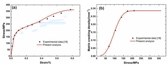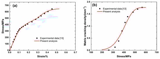 - Domain II, the nonlinear region due to matrix fragmentation. The domain starts from σmc = 200 MPa to the saturation matrix fragmentation stress σsat = 560 MPa, and the saturation fragmentation density of the matrix is approximately λsat = 1.76/mm, and the composite tensile strain is approximately εc = 0.34%.