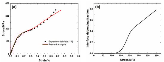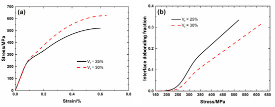 Figure 8 shows the tensile nonlinear curves and the evolution of interface debonding fraction for different fiber volumes. For low fiber volume Vf = 25%, the debonding fraction increases from η (σd = 166 MPa) = 0 to η (σuts = 521 MPa) = 0.33, and the failure strain of the composite is εf (σuts = 521 MPa) = 0.6%. For high fiber volume Vf = 30%, the debonding fraction increases from η (σd = 204 MPa) = 0 to η (σuts = 626 MPa) = 0.32, and the failure strain of the composite is εf = 0.64%. At high fiber volume, the debonding fraction at the same applied stress decreases, and the composite strain at nonlinear Domain II decreases, and the composite tensile strength and failure strain increase.
