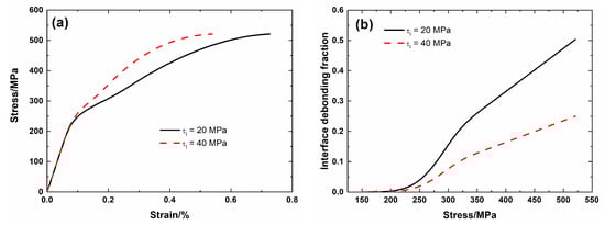 Figure 9 shows the tensile nonlinear curves and the evolution of the interface debonding fraction for different interface shear stresses. For low interface shear stress τi = 20 MPa, the debonding fraction increases from η (σd = 166 MPa) = 0 to η (σuts = 521 MPa) = 0.5, and the failure strain of the composite is εf = 0.73%. For high interface shear stress τi = 40 MPa, the debonding fraction increases from η (σd = 168 MPa) = 0 to η (σuts = 521 MPa) = 0.25; and the failure strain of the composite is εf = 0.25%. At high interface shear stress, the debonding fraction at the same applied stress decreases, and the composite strain at nonlinear Domain II decreases, and the composite failure strain decreases.