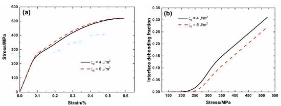 Figure 10 shows the tensile nonlinear curves and the evolution of the interface debonding fraction for different interface debonding energy. For low interface debonding energy ζd = 4 J/m2, the debonding fraction increases from η (σd = 192 MPa) = 0 to η (σuts = 521 MPa) = 0.31, and the failure strain of the composite is εf = 0.59%. For high interface debonding energy ζd = 6 J/m2, the debonding fraction increases from η (σd = 234 MPa) = 0 to η (σuts = 521 MPa) = 0.57, and the failure strain of the composite is εf = 0.57%. At high interface debonding energy, the interface debonding stress increases, the debonding fraction at the same applied stress decreases, and the composite strain during nonlinear Domain II decreases, and the failure strain of the composite decreases.