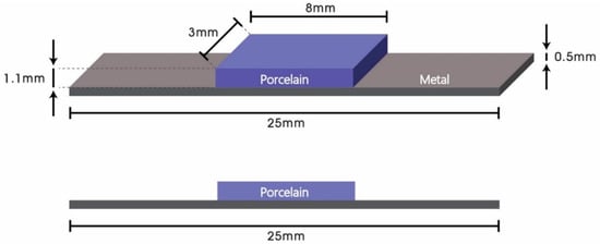 In the present study, 20 metal substrates of Co-Cr alloy (Star Loy C, Dentsply Sirona, PA, USA) were fabricated using the lost wax technique, and 60 metal substrates of Co-Cr alloy (Starbond CoS powder, Scheftner Dental Alloys, Mainz, Germany) were fabricated using SLM (Concept Laser Mlab, Concept Laser GmbH, Lichtenfels, Germany). Substrates were fabricated to have a parallelepiped shape with a width of 3 mm, length of 25 mm, and thickness of 0.5 mm according to ISO 9693 specifications. The 60 SLM metal substrates were divided into three groups of 20 specimens each; one without bonding agent (only sandblasted) and one treated with each commercial bonding agent. A single type of dental porcelain with dimensions of 8 × 3 × 1.1 mm was applied to the specimens. An illustration of a specimen used in the present study conforming to ISO 9693 guidelines is shown in Figure 2. Brand names, elemental compositions of the alloys, and manufacturers are provided in Table 1.