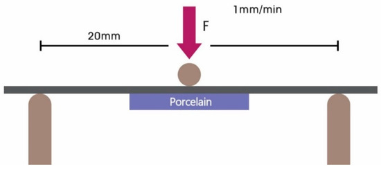 The three-point bending test performed according to the ISO 9693 standard is widely used to measure metal–ceramic bond strength (shown in Figure 3). Ceramic metal specimens were tested in a desktop universal testing device (TW-D102, Taewon Tech, Seoul, Korea) with a head displacement speed of 1.0 mm/min. Samples with ceramic superstructures were placed face down on the device, which was adjusted to a 20 mm distance between the two supports. The load was adjusted to proceed at the rate of 1 mm/min vertically to the center of the metal surface on the specimens until breaking of the metal-ceramic interface bond. The force (N) that caused crack initiation or fracture on the metal-ceramic interface was recorded by software (Trapezium X Material Testing Operation Software, Shimadzu, Kyoto, Japan) on a computer connected to the universal testing device.