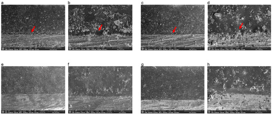 Scanning electron microscopy images of the Co-Cr and ceramic interface after sputtering with Au due to the low conductivity of ceramic. (a) Casted specimen, magnification 200×; (b) casted specimen, magnification 1000×; (c) SLM-fabricated specimen without bonding agents, magnification 200×; (d) SLM-fabricated specimen without bonding agents, magnification 1000×; (e) SLM-fabricated specimen with bonding agent A, magnification 200×; (f) SLM-fabricated specimen with bonding agent A, magnification 1000×; (g) SLM-fabricated specimen with bonding agent B, magnification 200×; (h) SLM-fabricated specimen with bonding agent B, 1000×. The red arrows indicate the thick oxide layer that looks like a gap between ceramic and metal.