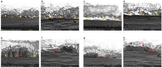 SEM images of specimens after the three-point bending test and before manual detachment of the ceramic portion. (a) Casted specimen, magnification 200×; (b) casted specimen, magnification 1000×; (c) selective laser melting (SLM)-fabricated specimen without bonding agents, magnification 200×; (d) SLM-fabricated specimen without bonding agents, magnification 1000×; (e) SLM-fabricated specimen with bonding agent A, magnification 200×; (f) SLM-fabricated specimen with bonding agent A, magnification 1000×; (g) SLM-fabricated specimen with bonding agent B, magnification 200×; (h) SLM-fabricated specimen with bonding agent B, magnification 1000×. Dotted lines represent the surface of the Co-Cr alloy. Yellow triangles indicate crack propagation and the large gap between the ceramic and metal layers. Red triangles indicate incomplete crack propagation.