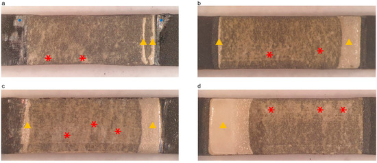 Optical microphotographs of Co-Cr alloy surfaces after de-bonding with ceramic (magnification 8×). (a) Casted specimen; (b) SLM-fabricated specimen without bonding agent; (c) SLM-fabricated specimen with bonding agent A; (d) SLM-fabricated specimen with bonding agent B. Yellow triangles represent adherent ceramic, and red asterisks indicate remnant wash opaque. Blue circles indicate remnant sputtered Au.