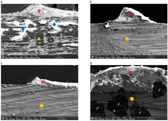 Scanning electron microscopy images (300×) of specimens after de-bonding of ceramic from the Co-Cr alloy surface. (a) Casting group; (b) SLM-fabricated specimens without bonding agent; (c) SLM-fabricated specimens with bonding agent A; (d) SLM-fabricated specimens with bonding agent B. Red asterisks represent adherent ceramic. Yellow triangles show Co-Cr substrate fabricated by casting, and yellow circles indicate Co-Cr alloy fabricated by SLM. Blue diamonds indicate wash opaque from ceramic on the Co-Cr substrate, while green arrows indicate remnant Au from sputtering.