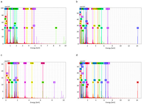 EDS analysis of the fractured Co-Cr and ceramic interface. (a) Casted group specimens; (b) SLM-fabricated specimens without bonding agent; (c) SLM-fabricated specimens with bonding agent A; (d) SLM-fabricated specimens with bonding agent B.