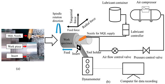 Turning experiments were performed on a TAKISAWA TC-1 CNC lathe machine (spindle speed 40–4500 rpm, spindle drive motor 5.5 kW, Takisawa, Okayama, Japan) using 6026-T9 aluminum alloy samples (60 mm length and 40 mm in diameter). The uncoated tungsten carbide tool is used as insert having a nose radius of 0.2 mm and a clearance angle of 7°. For each experiment, machining was completed up to a length of 2 cm using a new cutting tool. The machining is performed under dry and minimum quantity lubricant (MQL) conditions. Figure 1a shows the schematic of the coolant supply set up. The type of lubricant used is a vegetable oil (i.e., virgin olive oil) with a viscosity of 84 cp at 20 °C, specific gravity of 0.911 at 20 °C, and a boiling point of 700 °C. The lubricant was supplied at a flow rate of 150 mL/h and 5 bar pressure. The schematic of the experimental setup is shown in Figure 1b.