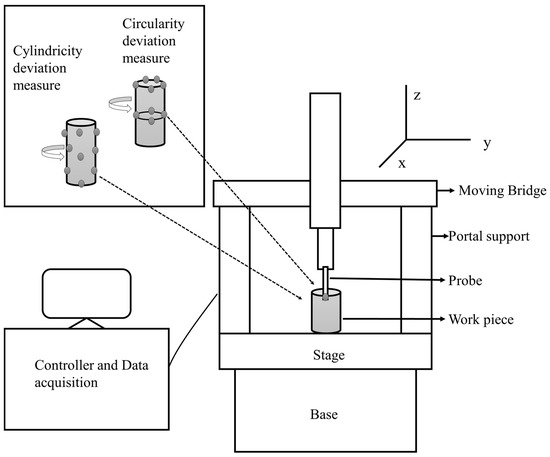 The cutting parameters considered are cutting speed, feed rate, depth of cut, and positive rake. The Taguchi orthogonal array mixture design is adopted in this study for experimental runs. Four levels are set for each cutting process parameter (as continuous factors), and two levels are set for cutting conditions (as a categorical factor). These are presented in Table 1. Based on these levels, a total of 16 experimental runs are planned, as tabulated in Table 2. The levels are set based on the literature review and recommendation by the tool manufacturer. The responses to be optimized are components of cutting forces and shape deviations of machined cylindrical bars. The cutting forces i.e., feed force (Ff), tangential forces (Ft), radial force (Fr) and resultant cutting forces (Fc) are experimentally calculated by using a Kistler 9257B dynamometer (Kistler, Winterthur, Switzerland) with the Kistler multichannel charge amplifier type 5070A (Kistler, Winterthur, Switzerland). Shape deviations are measured in terms of circularity or roundness (mm) based on ISO 6318 standard [38] and cylindricity (mm) deviation based on ISO 12180 standard [39] by using Tesa Micro-Hite 3D DCC 474 a coordinate measuring machine (Tesa SA, Renens, Switzerland) (CMM). The schematic of CMM is shown in Figure 2. The desired measured values of cylindricity (Cy) and circularity (Cr) for an experimental run are tabulated in Table 2. Circularity and cylindricity are essential performance parameters where cylindrical parts are subjected to high internal and external loads, and a small error causes excessive deformation and results in failure of components.