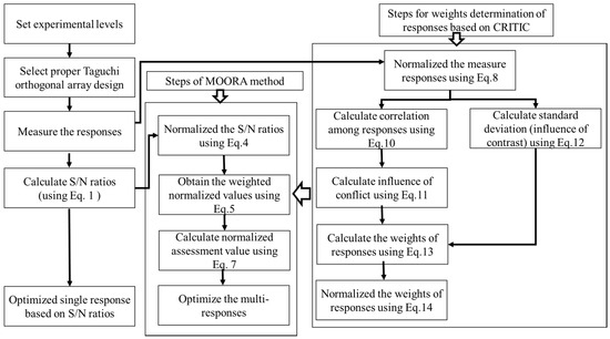 Figure 3 shows the steps followed for proposed multi-responses optimization using the Taguchi based signal to noise (S/N) ratios, coupled with MOORA and CRITIC. The Taguchi based signal to noise (S/N) ratios determine the deviation in the quality characteristics of responses from desired values. The ratio of mean values (signal) and standard deviation (noise) gives an objective function to responses. If the desired response’s objective function is to minimize, then the smaller-the-better quality characteristics are measured using Equation (1). However, for maximization, the larger-the better quality is measured using Equation (2).