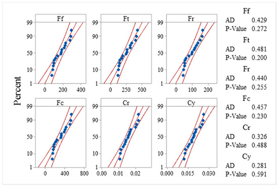 The distribution of experimental data was analyzed based on the probability plot. The plots are plotted at a 95% confidence interval and are shown in Figure 4. This shows that data points for all measured responses fall near the middle fitted line, and it is assumed that data follow normal distributions. The Anderson Darling (AD) test statistics value and p-value decide the null hypothesis’s acceptance and rejection concerning the normal distribution of data. The AD test statics value for each response data being low and the p-value being higher than 0.05, justifies that the collected data are normally distributed and can be used further for experimental analysis and optimization.