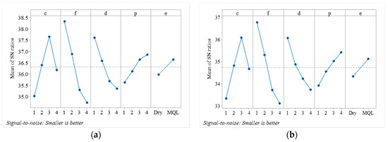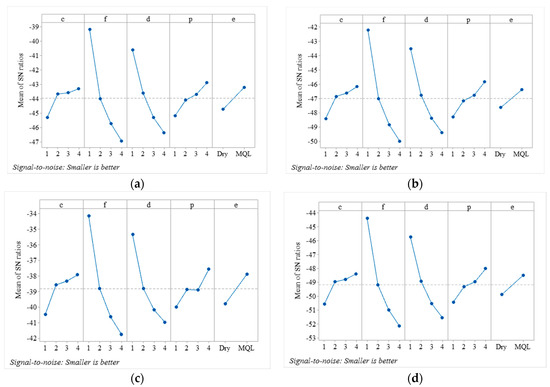 Table 5 shows the S/N ratios calculated for individual responses. The results show that the higher S/N ratios were obtained for the components of cutting forces (i.e., Ff, Ft, and Fc) at experimental run five (having c and d at level two, f at level one, p, at level three and cutting condition at level two i.e., MQL). However, for Fr, higher S/N ratios were observed in experimental run six (having c and f at level two, d at level one, p, at level four, and e, at level two i.e., MQL). For Cr and Cy, the higher S/N ratios computed are found in experiment nine (c and d at level three, f and e, at level one (dry), and p, at level four. The mean values of S/N ratios are computed at each level for each factor, and higher mean values of S/N ratios correspond to the optimal level. Figure 5a–d illustrates the main effect plot of mean values of S/N ratios for components of cutting forces (Ff, Ft, Fr and Fc), respectively). It shows that the final optimal levels based on mean S/N ratios of all components of cutting forces are c and p, at level four (800 m/min and 25°), f and d at level one (0.1 mm/rev and 1 mm) and e, at level two (MQL). Figure 6a,b depicts the mean S/N ratios of Cr and Cy, respectively. The optimal levels obtained are c, at level 3 (600 m/min), f and d at level one (0.1 mm/rev and 1 mm), p, at level four (25°) and e, at level two (MQL).