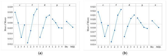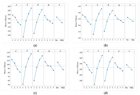 The effect of the cutting process parameters on individual responses is studied through the main effect plots of means. Figure 7 shows the main effect plot for means of a component of cutting forces i.e., Ff, Ft, Fr, and Fc. Figure 7a indicates that the feed forces (Ff) decrease with an increase in cutting speed and positive rake angle from low level to high level (i.e., 200 m/min to 800 m/min, and 10° to 25°), however, it increases with an increase in the feed rate and depth of cut from a low level to a high level (i.e., 0.1 mm/rev to 0.4 mm/rev and 1 mm to 2.5 mm). It is also observed that with the application of MQL, the Ff decreases. Similar results are obtained for tangential force (Ft), radial force (Fr), and resultant force (Fc), as illustrated in Figure 7b–d. These results are in good agreement with the literature. Kannan et al. [11] observed that under both dry and MQL conditions, cutting forces increase with an increase in feed rate. This is attributed to the increased contact area between the cutting tool and workpiece, which causes an increase in temperature at the interface and results in the formation of built-up edges. They also observed that with an increase in cutting speed the formation of built-up edges reduces, therefore reducing the cutting forces. High cutting speed results in high heat generation in the workpiece, which makes the workpiece more plastic and makes machining easier. According to Sood et al. [40], an increase in feed rate increase the thickness of chips and causes increases in the cutting force; the same findings are also supported by Ajay and Vinoth [9]. Sood et al. [40] also observed that with an increase in cutting speed, the extent of interaction between tool and chip decreases, and also the formation of built-up edges reduces, therefore, reducing the cutting forces. An increase in depth of cut increases the shear area, so higher tangential forces followed by feed force and radial force are required to cut the material [19]. Saleem et al. [47] investigated that an increase in the positive rake angle decreases the cutting forces. This is attributed to an increase in the tool and chip contact area resulting in the easy formation of chips. They also found that the chip–tool interface temperature increases with an increase in positive rake angle, resulting in an increase in strain in the workpiece and reduces the cutting forces. According to Dhar et al. [48], a positive rake angle causes tool edge sharpening. The tool sharpness reduces cutting forces and improves the surface quality of the machined specimen, but it reduces the tool life significantly. Additionally, an increase in cutting speed or feed rate damages the tool sharpness and causes an increase in the shape deviations of machined parts.