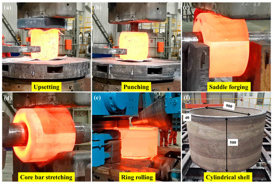 In this study, commercial-grade TA31 titanium alloy (Western Superconducting Technologies Co., Ltd., Xi’an, China) with the following chemical composition (wt%): Nb 2.87, Mo 1.00, Zr 2.05, Al 6.03, Si 0.021, Fe 0.025, C 0.0008 and Ti bal., was selected as the starting material. The cylindrical shell used in this study was manufactured from a forging rod with a diameter of 500 mm through upsetting, punching, saddle forging, core bar stretching and ring rolling (Figure 1a–e). The final size of this cylindrical shell was 900 mm in diameter, 500 mm in height and 40 mm in thickness (Figure 1f). The temperature range of each hot deformation process was strictly controlled at 960–800 °C. Finally, the entire forging was annealed at 900 °C for 2 h followed by air cooling to room temperature (RT).