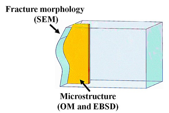 The impact specimens were cut from the center along the lengthwise direction for the initial microstructure to be examined (Figure 3). The specimens were ground and polished according to standard procedures. The polished specimens were chemically etched in a hydrofluoric acid solution (47 mL H2O + 2 mL HNO3 + 1 mL HF) (Binzhou Guangyou Chemical Co., Ltd., Binzhou, China). Then, the microstructures were investigated with an optical microscope (OM) (Zeiss, Axio Observer A1m, Jana, German). The fracture morphology was characterized by scanning electron microscope (SEM) Electron back-scattered diffraction (EBSD) measurements were carried out with an HKL Nordlysnano detector (Oxford Instruments, Abingdon, Oxfordshire, UK ) equipped on a ZEISS MERLIN Compact instrument at step sizes of 1.5 µm depending on the grain size being analyzed. Automated orientation analyses were performed with the Channel 5 software package (Oxford Instruments, Abingdon, Oxfordshire, UK).
