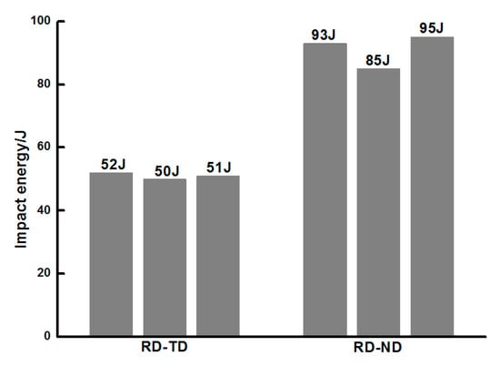 The impact toughness test results are shown in Figure 5. Three specimens were tested for each notch orientation. The average impact energy of the RD-ND specimen is 91 J, which is higher than that of the RD-TD specimen (51 J). The impact energy of the three parallel specimens in each group is not much different. A strong anisotropy of the impact energy is shown for different notch orientations.