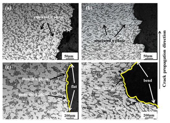 From the metallographic microstructure of the impact fracture near the notch (Figure 6), specimens selected from the RD-TD and RD-ND specimens have different α phase morphologies (Figure 6a,b). The main propagation mode of the cracks is intergranular fracture, accompanied by transgranular fracture. For the RD-TD specimen, the cracks mainly travel along the equiaxed α grain boundary, and the energy required is less than the propagation mode of a transgranular fracture. Hence, the impact energy is small with the flat crack propagation path and the impact toughness is low. Correspondingly, for the RD-ND specimen, when the crack passes through the elongated α phase, a large amount of energy is absorbed. Thus, the impact energy is higher with the bending crack propagation path and the impact toughness is also higher [30].