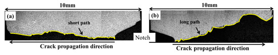 The representative crack propagation path in the impact specimens: (a) RD-TD specimen; (b) RD-ND specimen.