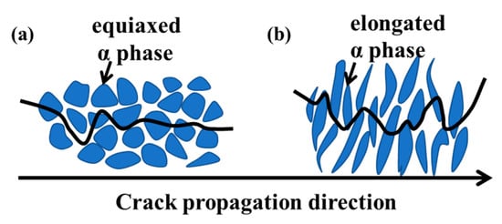 The crack propagation process in specimens with different grain shapes is clearly illustrated in Figure 10. The crack propagation path is shorter in the equiaxed α phase specimen. This is mainly attributable to the relatively weak obstructive effect of equiaxed α on cracks [32]. Cracks tend to propagate easily in the equiaxed α phase, as shown in Figure 10a. Therefore, the impact fracture of this specimen has the characteristics of short crack path length and low impact toughness. In contrast, the path of crack propagation is longer and rougher in the elongated α phase specimen compared to the equiaxed specimen, as shown in Figure 10b. The cracks of this specimen are difficult to propagate during testing, and thus have higher impact toughness.