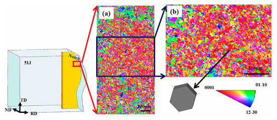 EBSD analysis was performed on the cross-sections of impact specimens with RD-TD and RD-ND. The test area was near the beginning of the impact crack, and the red box area was the test position. The test results of the RD-TD specimen are shown in Figure 11. Most of the α grain orientations in the test area are in the same direction. These areas correspond to the equiaxed α phase on the RD-TD plane. The α grain orientation can be clearly seen in the enlarged EBSD map in Figure 11b, and the hexagonal α phase exhibits a c-axis parallel to the ND direction.