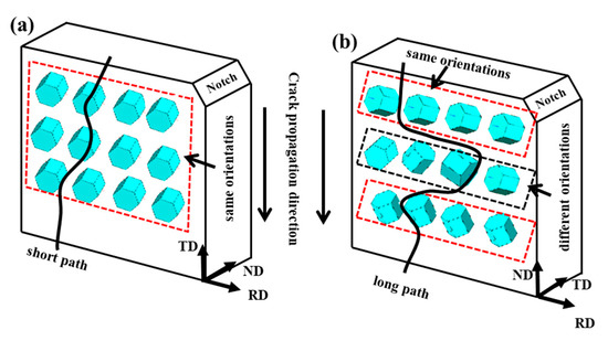 Schematic of the effect of microstructure on the crack propagation behavior for the (a) RD-TD specimen and (b) RD-ND specimen.