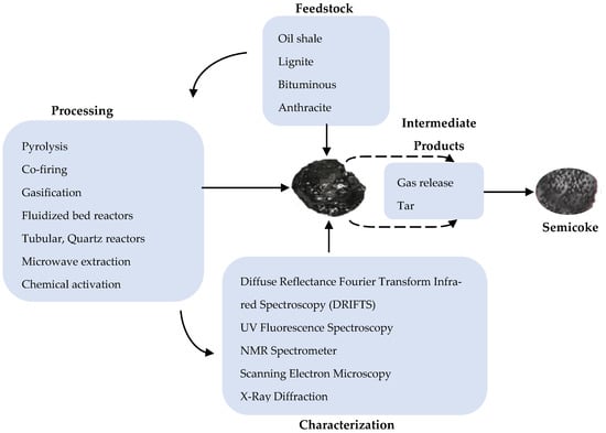 Amongst the noted sources of SC, lignite and oil shale are difficult to ignite due to their low organic and mineral matter content [43]. Since SC is described as an environmental problem, the appropriate production methods to reduce its footprint is constantly under investigation. Pyrolysis time, coal particle size, and environmental pressure are classified as some essential ingredients to produce high yielding SC [11]. For instance, high-pressure impregnation and heat treatment methods have proven to yield good-performing desulfurization SC adsorbents [34]. The use of fluidized bed reactors [18], fixed bed reactors [44], and drop tube reactors [45] have recently been reported as reducing the amount of SC produced during gasification processes. A description of oil shale SC production methods including the Galoter retorting process, the ATP process, the Brazilz petrosix, Kivitier, and Fushun type retorts have been provided [46]. Although these SC traditional pyrolysis production methods are widely used, there are noted limitations such as slow heating velocities, hence requiring a longer time to initiate combustion and generate uneven heating, which affects the SC yield in terms of structure formation, which leads to lower efficiencies [47]. The ecologically clean ‘Termokoks’ process of producing SC from lignite was demonstrated by [48].