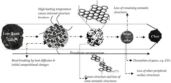 Figure 4 illustrates a generic flow process of SC formation from a typical LRC. Due to its macromolecular structure, relatively high heating (pyrolysis) is required to breakdown the networked matrix creating significant pores of varying sizes for intraparticle dispersion to take place. Low pyrolysis events may occur, however might affect its yield. Most of the surface and internal components of the SC are evaporated during initial pyrolysis events. The heating process further causes a transformation in aromatic and aliphatic structures at high temperatures resulting in significant losses and decomposition (e.g., from four rings to two rings) of aromatic structures, affecting yield [26]. However, this can be maintained at low-temperature pyrolysis events. These conversions are similar under the mentioned SC processing methods with slight differences occurring during the initial handling of the SC and heating periods.