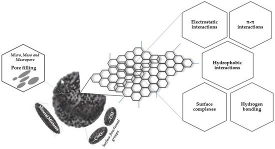 To efficiently remove or treat contaminants by SC depends on the nature of the contaminant and its properties. It is therefore obvious that while removal mechanisms of some contaminants may require small quantities of SC sorbent application, others may require large quantities of application before reaching sorption removal efficiencies. Variation in the organic structure, surface functional groups, and electrical properties of both SC and contaminants are important determining factors in the adsorption removal process. The presence of surface oxygen functional groups on SC surfaces contribute significantly to the contaminant adsorption process while acidic, amine, and other aromatic groups partly contribute electron-acceptor donor interactions. During SC production processes, charged surface groups are established, which ignite electrostatic attraction, however, depending on the size of each atomic charge present and their relative distances [89]. If negative charges dominate, it is easier to attract positively charged organic compounds thereby quickening the adsorption process. It may therefore be necessary, during the surface functionalization process, to introduce more negative functional groups. The different factors involved in the adsorption mechanism of SC are illustrated in Figure 5.