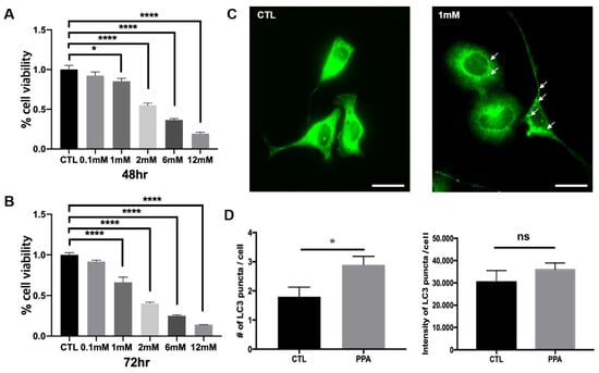 Figure 1B). Therefore, we used 1 mM PPA for 72 h to assess autophagy in SH-SY5Y cells. The number of LC3 puncta in PPA-treated cells was increased, as shown by immunofluorescence (