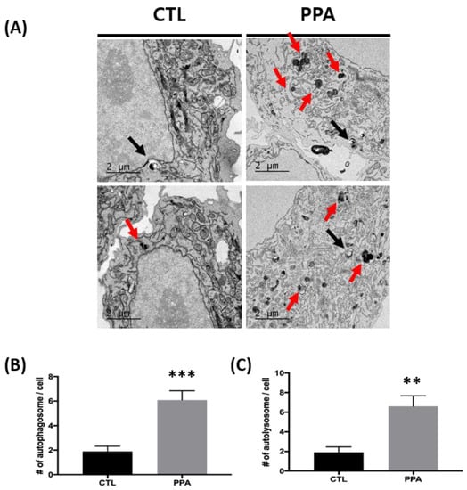 We further analyzed the number of autophagosomes and autolysosomes in control and PPA-treated cells using TEM images. The numbers of both organelles were increased in PPA-treated cells. The numbers of autophagosomes per cell were 6.1 ± 0.7371 and 1.9 ± 0.4333 for treated and control cells, respectively (