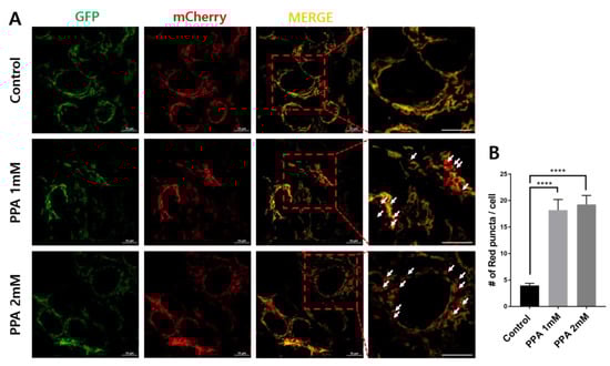 Figure 3A). After treatment with 1 or 2 mM PPA, the number of mCherry red puncta increased 4.6 times, indicating the induction of mitophagy in treated cells (