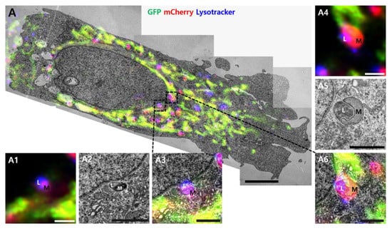 22], we used GFP and mCherry conversion depending on the pH level of lysosomes to investigate details of various steps of mitophagy in nano-resolution though electron microscopy (EM). The CLEM technique of overlaying two images from fluorescence and EM makes the investigation of all phases of mitophagy possible. Evans et al. suggested that CLEM can open new avenues using light-up through (fluorescent) dyes in the dark by EM observation [