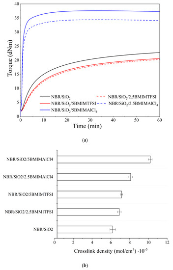 Rheometric curves for silica-filled nitrile rubber (NBR) composites with different ionic liquids (a) and crosslink densities of the resulting NBR vulcanizates (b).