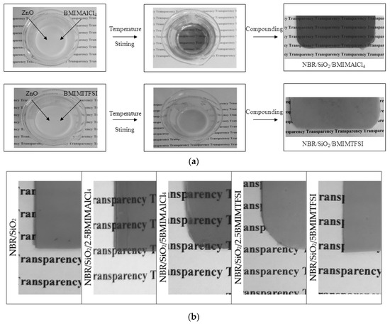 Effect of imidazolium ionic liquids: 1-butyl-3-methylimidazolium tetrachloroaluminate (BMIMAlCl4) and 1-butyl-3-methylimidazolium bis(trifluoromethylsulfonyl)imide (BMIMTFSI) with different anions on the transparency of NBR composites (a) and changes of the transparency (b).