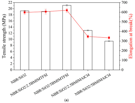 As can be seen in Figure 3a, the presence of the both ILs affected the static-mechanical properties of the silica-filled NBR composites. However, particularly remarkable changes were observed in the case of samples containing IL with AlCl4 ions. The addition of 2.5 and 5 phr of hydrophilic BMIMAlCl4 in the NBR polymer significantly increased the stiffness of the samples, as shown by the lower elongation at break (Eb). A drop in the tensile strength (TS) value from 19.1 to 9.5 MPa was observed for NBR/5BMIMAlCl4 in comparison to the NBR/SiO2 reference sample. This was related to the higher values for the crosslink density of the composites and is in agreement with data obtained from swelling experiments and rheometric measurements. Compared to the reference sample, the incorporation of BMIMTFSI ions led to an increase in the Eb parameter, which was related to the higher elasticity and flexibility of the rubber materials. The tensile strength of the NBR sample containing hydrophobic BMIMTFSI was higher than that of the other composites. At a given strain, an increase in stress was noted when 5 phr of BMIMTFSI was added (21.1 MPa), compared to the neat NBR/SiO2 (19.1 MPa). The improved mechanical properties of the NBR samples may be related to the reduction of the filler agglomerates and to the enhancement of filler–filler or rubber–filler interactions after the addition of ILs.