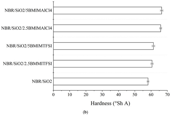 As expected, based on crosslinking density measurements, the NBR/SiO2/BMIMAlCl4 composites also showed the greatest value for hardness, with a figure of 65.5 on the Shore A scale (Figure 3b). Based on the results of tensile tests, the addition of BMIMAlCl4 decreased the elasticity and increased the hardness of the vulcanizates in comparison to the reference.
