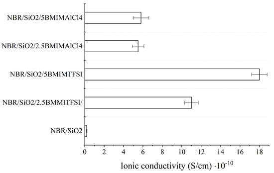 The addition of ILs resulted in an increase in the ionic conductivity of the studied composites (Figure 5). The ionic conductivity of the obtained NBR composites is generally dependent on the conductivity and ion concentration of the pure IL. Typical values for IL conductivity measured at 25 °C range from 1.0 to 10.0 mS/cm. Hydrophobic BMIMTFSI has a conductivity of 3.5 mS/cm (25 °C) and the hydrophilic BMIMAlCl4 has a conductivity of 9.2 mS/cm (25 °C). The improvement of ionic conductivity in the NBR ionic liquid-based systems is purely based on the contribution of ions [34]. The ionic conductivity values of the NBR/SiO2 samples containing 2.5 and 5 phr of BMIMAlCl4 increased from 5.6·10−12 to 5.5·10−11 and 5.8·10−11 S·cm−1, respectively. Interestingly, the samples that contained BMIMTFSI salt exhibited conductivities of 1.1·10−9 S·cm−1 (2.5 phr) and 1.8·10−9 S·cm−1 (5 phr), respectively, at the same concentrations of IL. This observation may be related to the active participation of the AlCl4 anions in the crosslinking process or to the lower compatibility of this IL with the hydrophobic polymer.