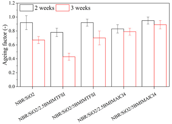 The static mechanical properties were also measured after thermooxidative ageing over two or three weeks, to calculate the ageing factor K (Figure 6). After two weeks, slight changes in the K parameter value were observed, but the subsequent changes exhibited after three weeks by the samples with BMIMAlCl4 were insignificant. It can be concluded that BMIMAlCl4 stabilized the rubber mixtures. According to Maciejewska et al. [29], ILs containing chlorides may be assumed to catalyze interfacial reactions, by acting as a catalyst for crosslinking reactions. In the case of BMIMAlCl4, the crosslinking density can be attributed to the high efficiency of the reaction between the unsaturated C = C bond in the rubber and the curing agents. The improved ageing stability of the composites containing ILs was most likely related to the limited increase in the crosslink density.
