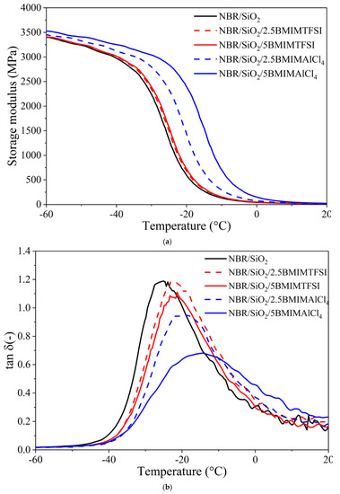 Figure 7a,b shows the dynamic-mechanical properties of NBR composites containing ILs, in terms of the storage modulus and loss tangent (tanδ) as functions of temperature. It can be seen that the storage modulus moved toward higher values across the entire temperature range, especially after the application of BMIMAlCl4 in the silica-filled NBR system. This shift can be attributed to the strong influence of the ILs on the curing kinetic, as has been previously described by other authors [35,36]. However, it was observed that samples filled with 5 phr of ILs had higher values for the storage modulus, compared to those with 2.5 phr. The reason for this may be the improved dispersion of silica particles in the NBR matrix, due to the higher concentration of ILs, which led to the formation of stronger three-dimensional networks of silica.