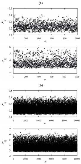 Figure 2a,b show the values of factors and for the particular Monte Carlo trials and for the total MC draw equal to 103 and respectively. There are no figures for the number of MC draws equal to 105 and due to their lack of legibility (i.e., their high concentration of random points).