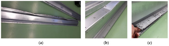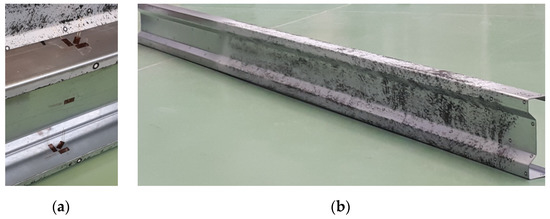 So-called fork boundary conditions at laboratory circumstances was obtained by usage of a bolted hinge connection at the support, which enables free rotation in the beam plane. Additionally, special washers were applied to the beam at the points of concentrate forces occurrence. They were introduced in order to prevent local damage of the tested sigma beams. Such points were detected at the support region (Figure 3a), where the hot-rolled C profile was used, and at the point of application of external concentrated force, where the hot- rolled C100 profile with length of 200 mm was applied to ensure the load distribution over the entire flange area (Figure 3b). The process of sample preparation were shown in Figure 4. The Zwick and Roel (ZwickRoell GmbH & Co. KG, Ulm, Germany) testing machine at the Construction Laboratory of the Lublin University of Technology was used in order to perform experimental tests. The load increase was controlled by means of the extending piston press at a speed of 1 mm/min, recording the force every 0.01 s. During laboratory tests, strain measurement was carried out using three electrofusion strain gauges type TENMEX TFs-10 with 120 Ω ± 0.2% resistance. In each sample, the electrofusion strain gauges (T1, T2, T3) were located in the middle of its span. The arrangement of these gauges is presented in Figure 2—Section B-B and in Figure 5b. On the other hand the displacements were measured using the Aramis system and GOM Correlate software. For this purpose, a unique combination of two Aramis coupled devices and a Tritop machine was used, which enabled precise measurement of the displacement of the beam subject to significant rotation. The displacements of the specimens were measured at six measuring points (P1, P2, P3, P4, P5, P6) located in the middle of the beam span and affixed with special markings shown in Figure 5b.
