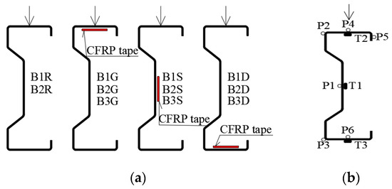 Scope of the tests: (a) steel tapes location and sample symbols; (b) measuring points in the middle span of the beam (electrofusion strain gauges—T1, T2, T3; displacement measurement—P1, P2, P3, P4, P5, P6).