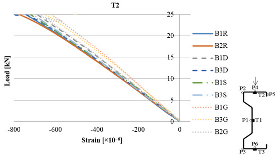 Load–strain diagram based on the reading from the T2 strain gauge.
