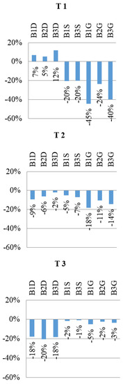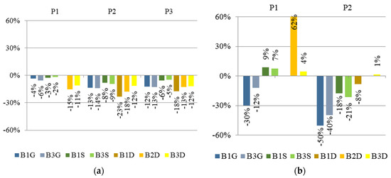The percent change in vertical displacement is presented in Figure 10a and for horizontal displacement in Figure 10b. Positive values described increase in displacement, while negative values indicate a reduction in displacement.